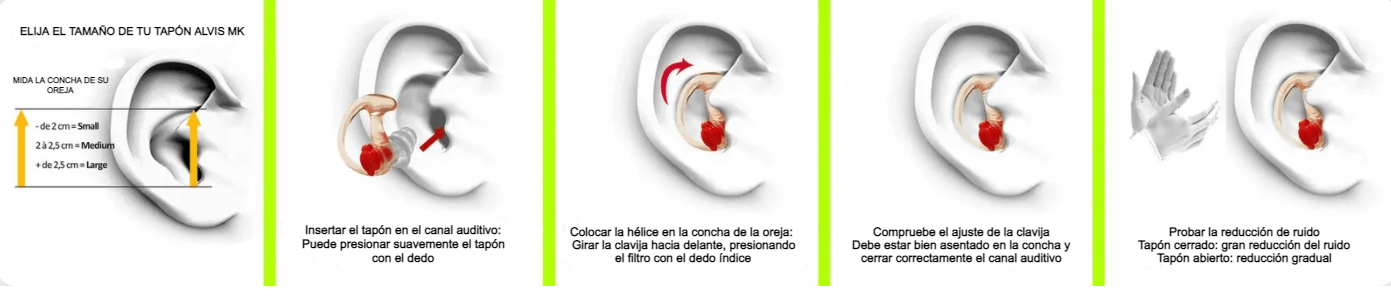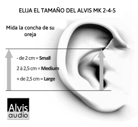 Measure the size of the concha of your ear as shown in the pictures above. The concha is the hollow part of the ear where the helix of the earplugs will be placed. Less than 2 cm: size S, from 2 to 2.5 cm: size M and more than 2.5 cm: size L.