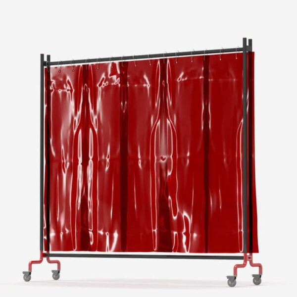 Biombo de 1,96 m de ancho x 1,95 m de alto equipado con 5 láminas de G 0,4 x 1600 x 470 mm para separar el soldador de su entorno. Las láminas filtran la luz nociva de la soldadura y evitan que las proyecciones puedan salir de la zona de soldadura. Están certificadas según ISO 25980.
