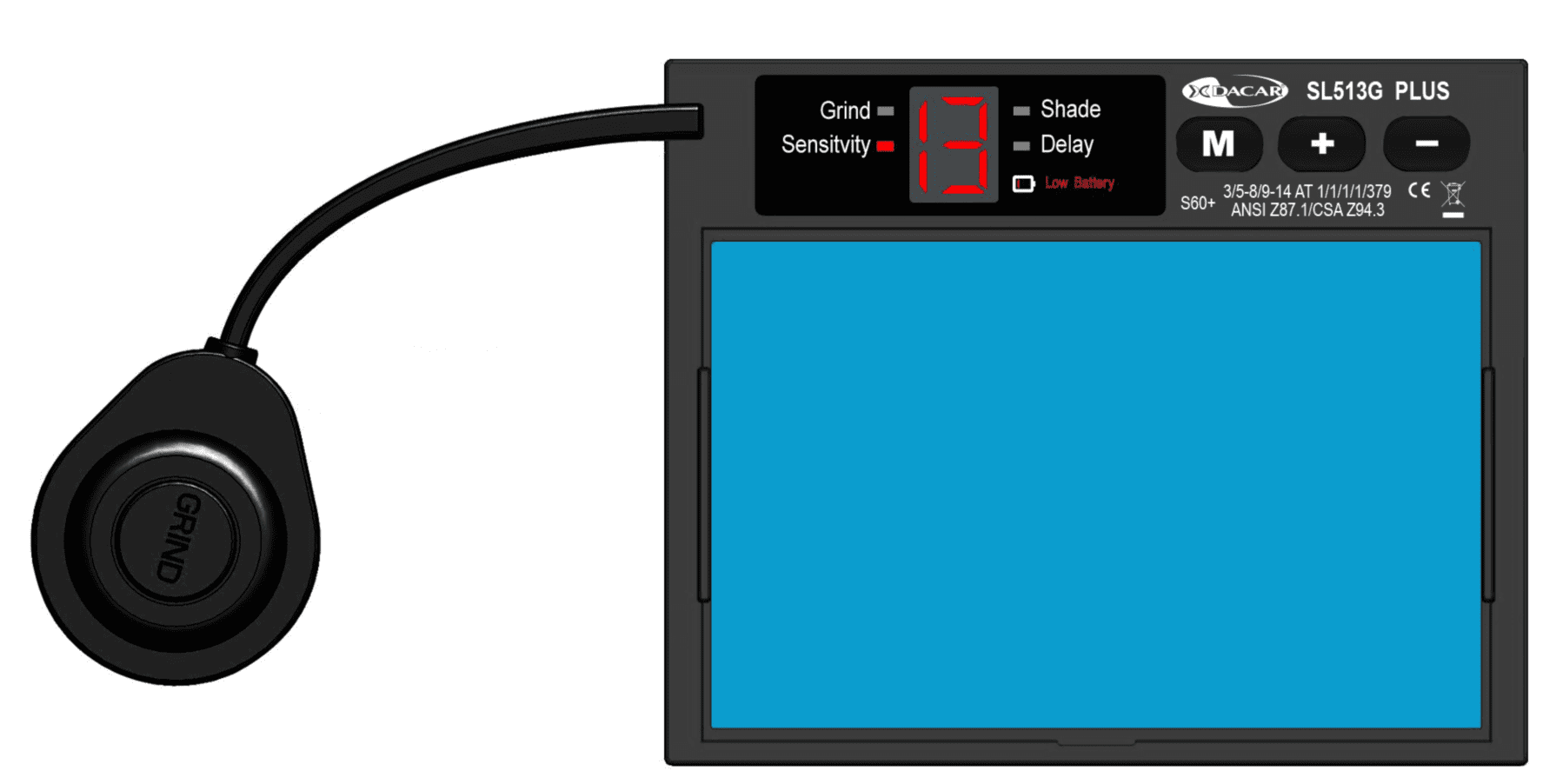 El filtro electrónico SL513G Plus es innovador en su tecnología que sustituye componentes electrónicos por un micro-chip lo cual hace de ese modelo un referente en cuanto a fiabilidad y versatilidad de usos además de reducir su peso. Equipado con un display LCD donde encontrarás toda la información acerca de los reglajes seleccionados, podrás regular tono oscuro (con doble rango de 5 a 8 y 9 a 14), sensibilidad y tiempo de esclarecimiento con pulsadores digitales mientras que su práctico botón interruptor exterior te permitirá cambiar del modo soldadura a modo esmerilado en un click sin necesidad de levantar la careta ni de quitarte los guantes.